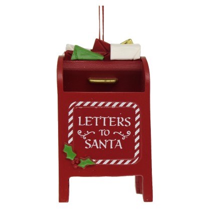 THIS HALLMARK CHRISTMAS ORNAMENT IS MADE OF RESIN AND MEASURES APPROX. 3" X 1.75".HAS A MESSAGE ON MAILBOX. "LETTERS TO SANTA" ON FRONT, "SHARING AND SPREADING JOY" ON BOTH SIDES.