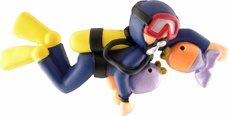 THIS CHRISTMAS ORNAMENT IS MADE OF POLY RESIN AND MEASURES APPROX 2" X 7". IT IS OF "KEVIN THE UNDERWATER ADVENTURER".