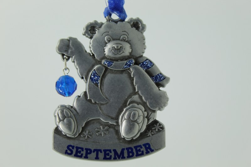 THIS CHRISTMAS ORNAMENT IS OF A TEDDY BEAR THAT SAYS SEPTEMBER WITH A BLUE BALL. IT MEASURES APPROX. 2.5" X 2" AND IS MADE OF METAL.
