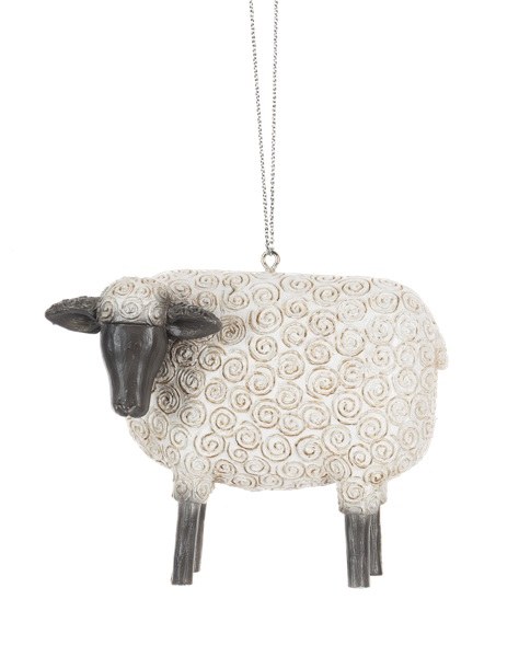 THIS CHRISTMAS ORNAMENT IS OF A RESIN SHEEP. IT MEASURES APPROX. 3" X 3.5".
