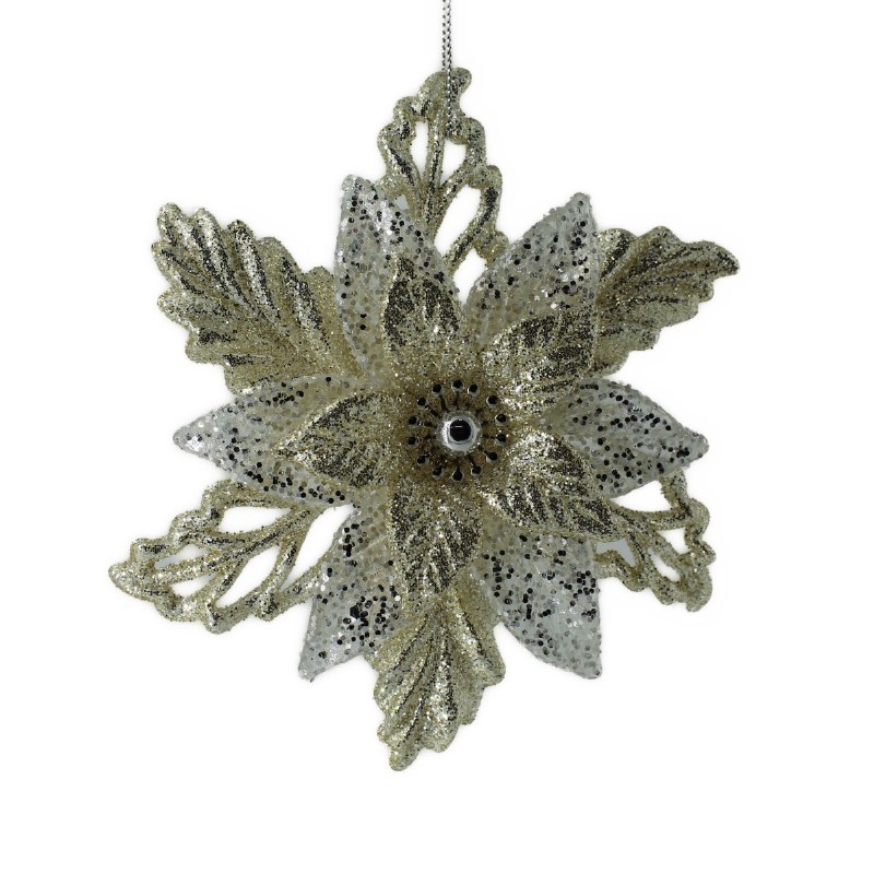 THIS CHRISTMAS ORNAMENT IS OF A POINTSETTA. IT MEASURES APPROX. 5" X 4.75" AND IS MADE OF ACRYLIC.