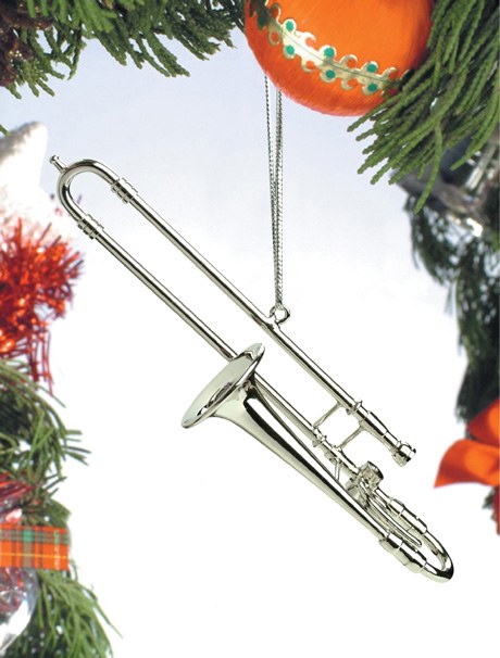 THIS CHRISTMAS ORNAMENT IS MADE OF METAL AND MEASURES APPROX. 4.25" X 1" X 0.75". SILVER TROMBONE.