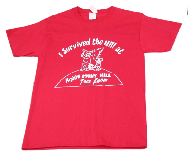 THIS T-SHIRT IS OF AN ADULT SMALL WITH OUR WHITE DECAL THAT SAYS " I SURVIVED THE HILL AT KOHLS STONY HILL TREE FARM". ALSO FEATURES A ADULT AND CHILD CUTTING A TREE. WE WILL CALL WITH COLOR OPTION AS THE DO VARY AT THE TIME OF PURCHASE.