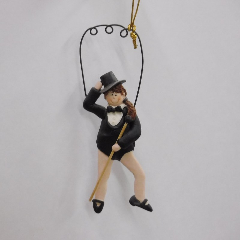 THIS CHRISTMAS ORNAMENT IS MADE OF RESIN AND MEASURES APPROX. 3.5" X 2" AND IS A GIRL IN BLACK AND WHITE WITH TAP SHOES. THIS ORNAMENT CAN BE PERSONALIZED.