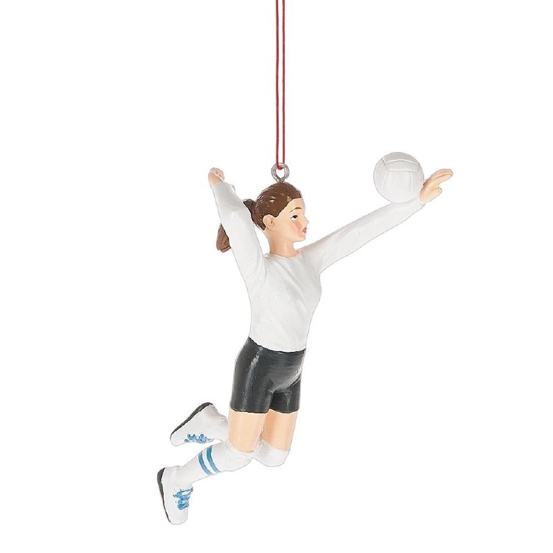 THIS CHRISTMAS ORNAMENT IS MADE OF RESIN AND MEASURES APPROX. 3.75" X 1.75" AND IS OF A WOMEN VOLLEYBALL PLAYER.
