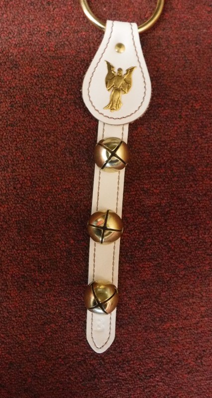 BLESSING ANGEL CHARM ON A 12" LEATHER WHITE STRAP WITH LARGE BRASS RING TOP.