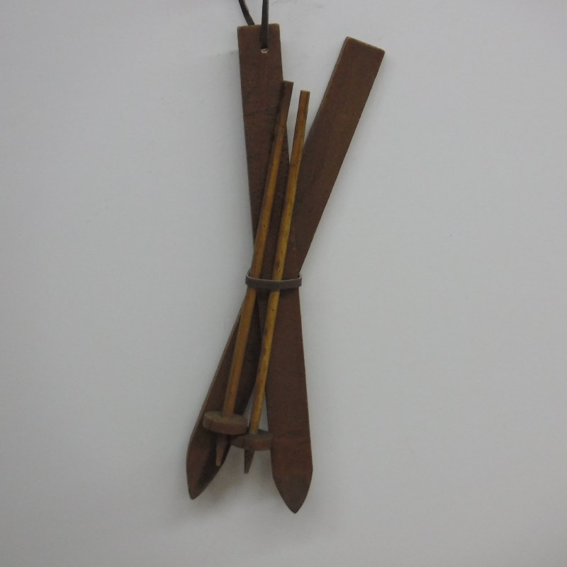 THIS CHRISTMAS ORNAMENT IS A PAIR OF WOODEN SKIES WITH WOODEN POLES. MEASURING 9" X 3"