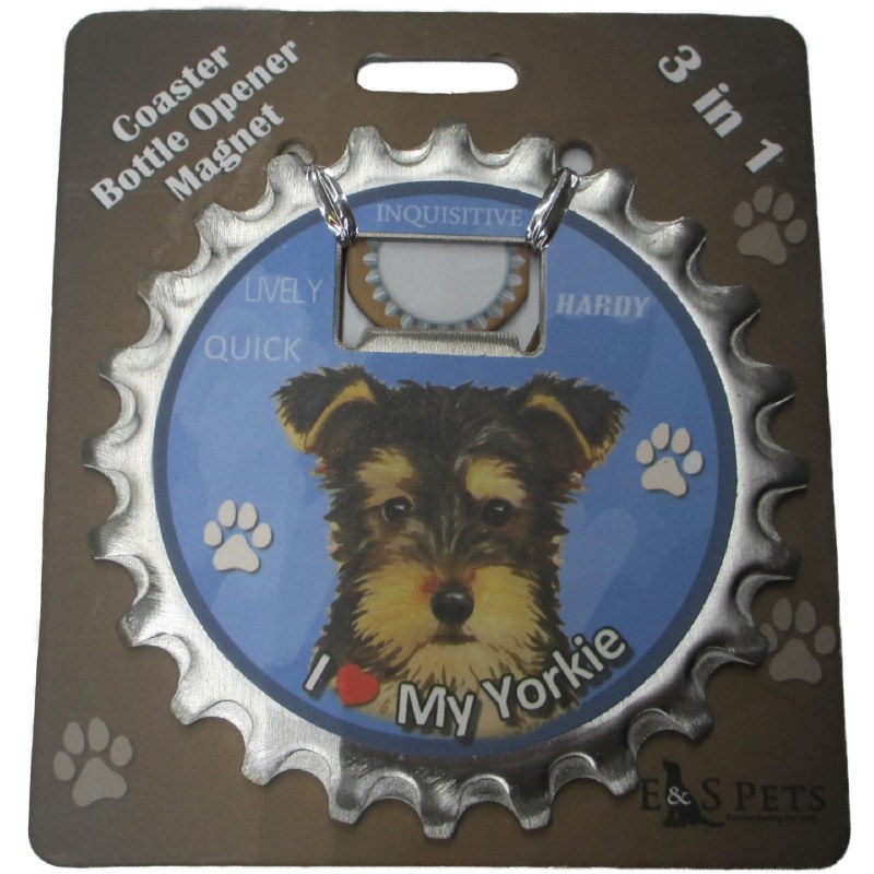 THIS CHRISTMAS ORNAMENT IS A 3-1 GIFT. CAN SERVE AS A COASTER, BOTTLE OPENER, OR MAGNET. HAS A PICTURE OF A YORKIE ON IT. ITEM IS APPROX 4" X 4"