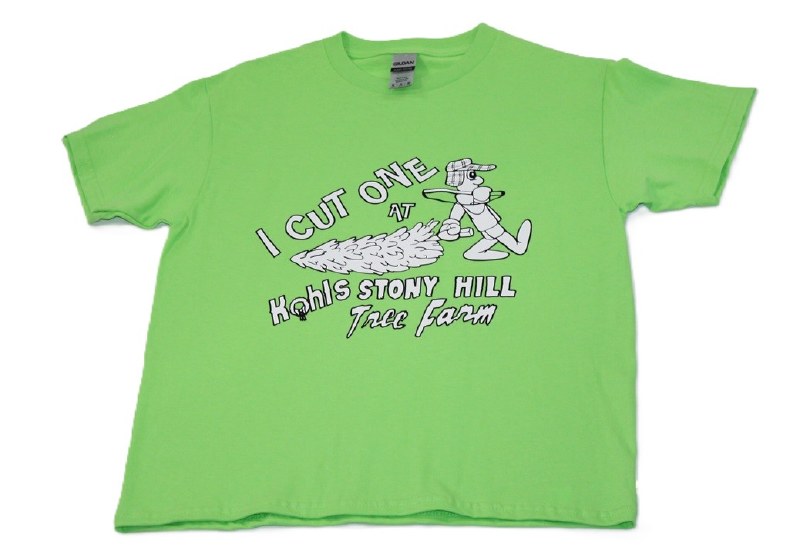 THIS T-SHIRT IS OF YOUTH MEDIUM WITH OUR WHITE DECAL THAT SAYS " I CUT ONE AT KOHLS STONY HILL TREE FARM". ALSO FEATURES A PERSON DRAGGING A TREE WITH A SAW. WE WILL CALL WITH COLOR OPTION AS THE DO VARY AT THE TIME OF PURCHASE.
